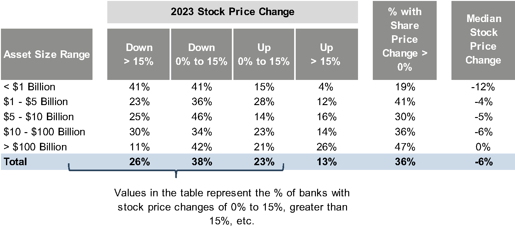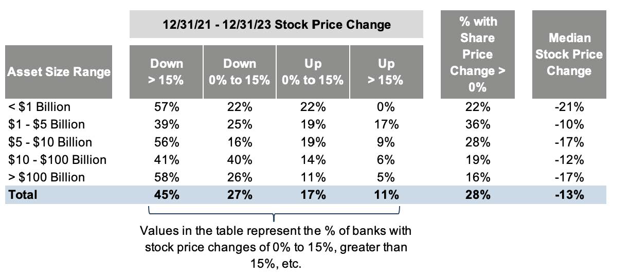 Figure 4 replicates the analysis for the period between year-end 2021 and year-end 2023. Not all banks have struggled through this rising rate environment, as 28% of banks reported share price appreciation over the two-year period. Nevertheless, the largest number of banks have experienced a 10% to 20% decline in their share prices.