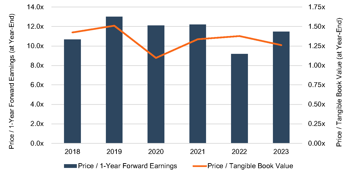 With the share price recovery in late 2023, publicly traded banks with assets between $1 and $15 billion reported a median price/one year forward earnings multiple of 11.5x and a price/tangible book value multiple of 1.26x. As indicated in Figure 8, these multiples are in-line with the range over the last five years. Therefore, the catalyst for further share price appreciation likely will be earnings improvement rather than P/E multiple expansion.
