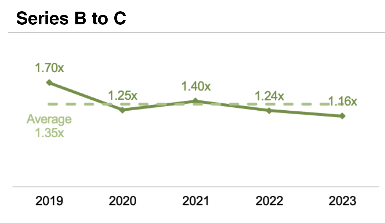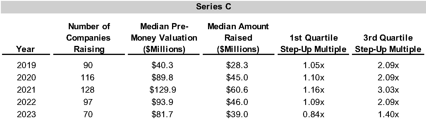 Interestingly, the median Series C medtech step-up multiple peaked in 2019 at 1.70x and fell every year except for 2021. The median Series C step-up multiple in 2023 was 1.16x, and the average step-up over the period was 1.35x. 5