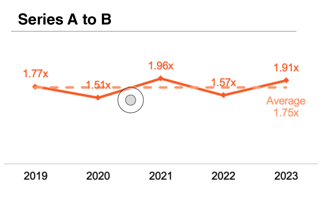 The median Series B medtech step-up multiple increased from 1.77x in 2019 to 1.96x in 2021 before falling to 1.91x in 2023.The average step-up over the period was 1.75x.4