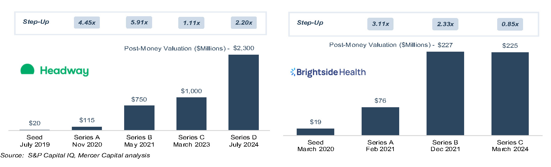 Valuation step-up multiples are a representation of the increase, or decrease, in a company’s valuation between rounds of funding. The multiple is calculated by dividing the most recent round’s implied valuation by the previous round’s implied valuation.1 For example, consider an early-stage company valued at $25 million (post-money) in its Series A funding round and valued at $50 million (pre-money) in its Series B funding round. The valuation step-up from Series A to Series B for this company would be 2.00x ($50 million/$25 million).In other words, the valuation at Series B was two times the valuation at Series A.As illustration, the following charts provide examples that illustrate the valuation history and implied step-up multiples for Therapymatch, Inc. (d/b/a Headway) and Brightside Health, Inc.2