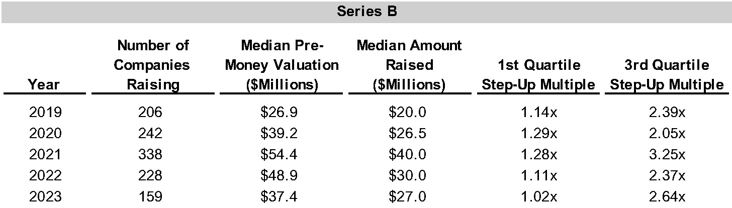 The valuation of an early-stage company can be influenced by many factors including technical milestone achievements, revenue growth, profitability profile, management team, industry trends and conditions, and the overall economy.Step-up multiples allow us to analyze how a company’s valuation has changed over time and between funding rounds. Step-up multiples greater than 1.0x imply that the company increased in value between rounds (up-round) while step-up multiples less than 1.0x imply that the company decreased in value between rounds (down-round). An increase in valuation between rounds can be because of exceeding financial performance expectations and/or achieving key milestones. And a decrease in valuation between rounds can signal that a company underperformed expectations and did not achieve specific milestones or benchmarks.
