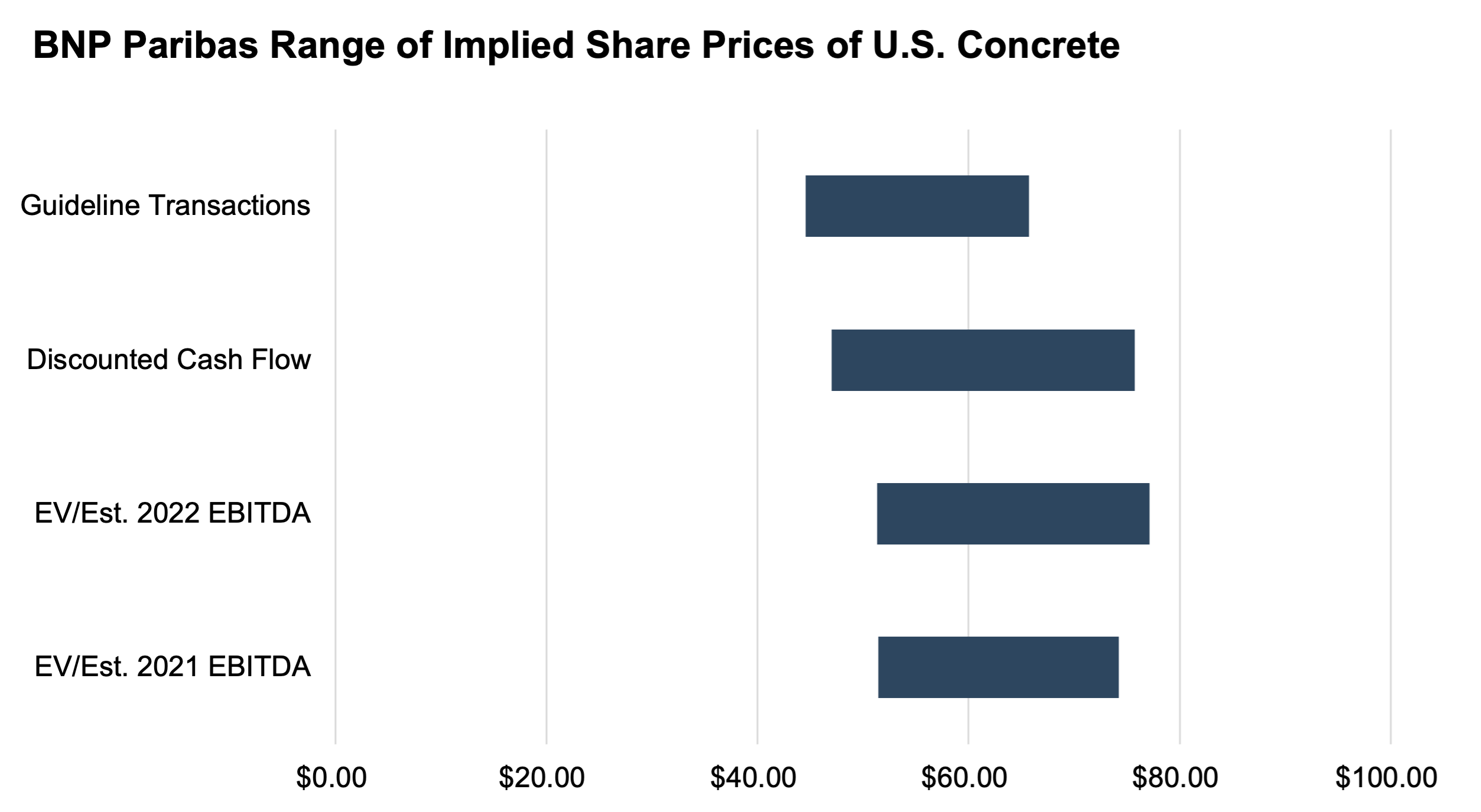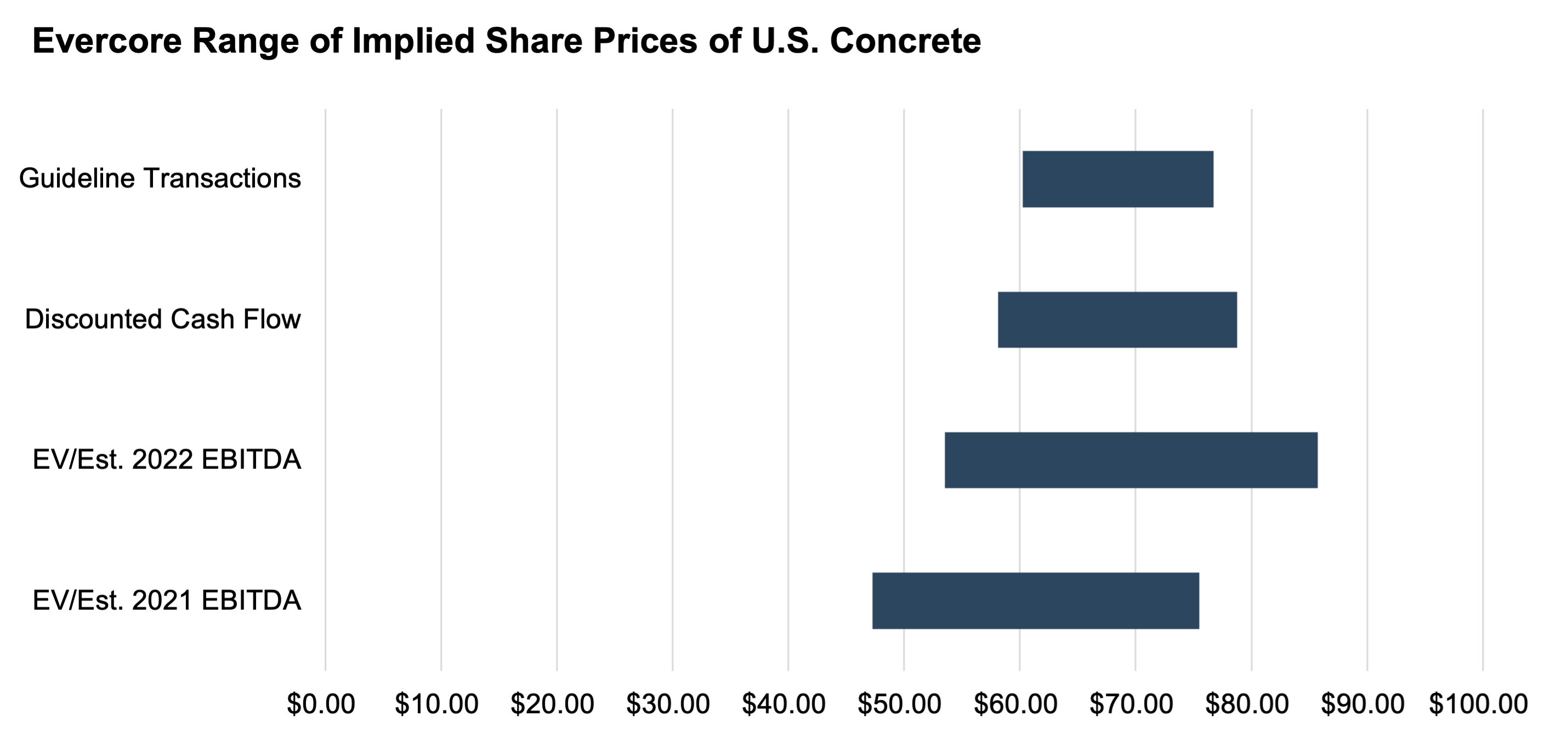 Both banks reviewed the 52-week trading history ending on June 4, 2021 ($20.77-$78.99 per share) for U.S. Concrete and compared this range to both the merger price of $74.00 per share and the closing price on June 4th at $57.14 per share. However, both banks noted that they only used this data for informational purposes and that it was not taken into consideration for the valuation process of U.S. Concrete.