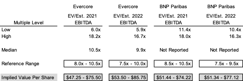 Both banks used publicly available market estimates and financial data, including S&P Cap IQ, to estimate EBITDA; however, BNP Paribas also took consensus analyst research estimates into account when determining the figures. When determining the relevant range, both BNP Paribas and Evercore used qualitative factors such as size, market exposure, growth prospects, and profitability levels alongside quantitative factors. A quick glance at the table above indicates that Evercore’s reference range for both EV/estimated 2021 EBITDA and EV/estimated 2022 EBITDA generally falls above the lowest observed multiple on the low-end and approximates the median observed multiple on the high-end. While BNP Paribas’ respective reference ranges are nearly identical to Evercore’s reference ranges, BNP Paribas’ reference ranges fall below the lowest multiples observed for its selected GPCs. Presumably, Evercore’s selection of four additional GPCs has influenced Evercore’s reference ranges.