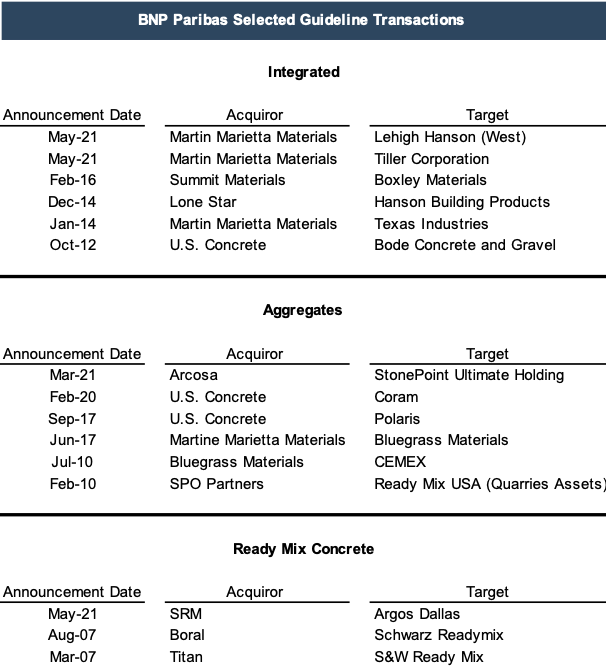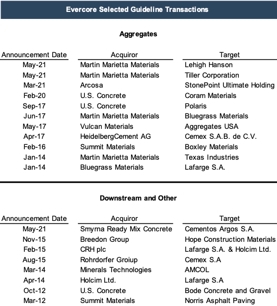 Evercore and BNP Paribas both explored past transactions of controlling interests in companies operating in the same industries as U.S. Concrete and Vulcan Materials to make assumptions about the equity value based on the implied multiples of each transaction. The transactions examined by each company are listed below. Evercore segregated its selected guideline transactions into two groups, Aggregates and Downstream and Other while BNP Paribas segregated its selected guideline transactions into three groups, Integrated, Aggregates, and Ready-Mix Concrete.